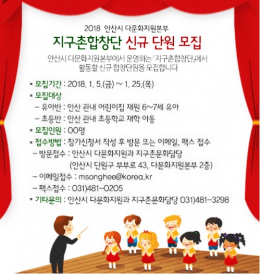 안산시 다문화지원본부(본부장 이장원)는 2018년 지구촌합창단에서 활동할 신규 합창단원을 모집한다.