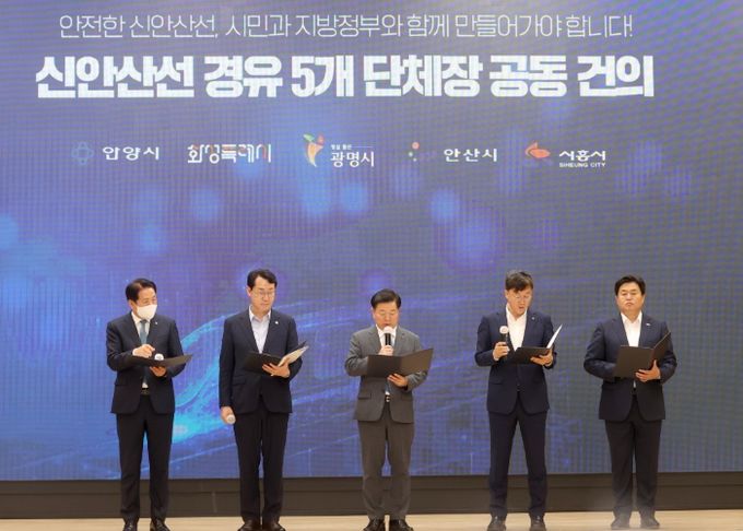 광명시, 안양시, 시흥시, 화성시, 안산시 등 5개 지방자치단체장은 15일 오전 광명시청 중회의실에서 ‘신안산선 광역철도의 안전 시공을 위한 신안산선 통과 지자체 공동 대응 건의문’에 서명했다. 건의문은 신안산선 공사 관련 기관·업체인 국토교통부, 국가철도공단, 시공사와 시행사에 전달한다.