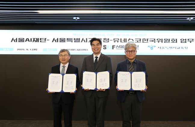 [와이뉴스] 서울AI재단은 9월 1일 오전 10시, 서울AI스마트시티 센터에서 서울특별시교육청, 유네스코한국위원회과 함께 책임 있는 AI 활용을 위한 업무협약(MOU)을 체결했다.