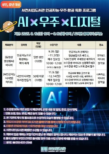 참여 신청은 9월 10일 오전 10시부터 9월 16일 오후 6시까지 사천시립도서관 홈페이지에서 선착순 접수로 이뤄진다.