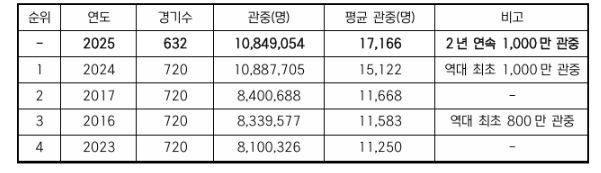 [와이뉴스] KBO 리그가 단일 시즌 역대 최다 관중 신기록 수립을 눈앞에 두고 있다. 9월 4일(목)까지 KBO 리그는 632경기만에 1,084만 9,054명의 관중이 야구장을 찾아 기존 단일 시즌 최다 관중 기록이었던 2024시즌의 1,088만 7,705명에 3만 8,651명을 남겨 뒀다. 출범 첫 시즌이었던 1982년 총 143만 8,768명의 관중으로 시작했던 KBO 리그는 마흔 네번째 시즌 만에 2년 연속 1,000만 관중을 넘어서는 프로스포츠 리그로 성장했다.