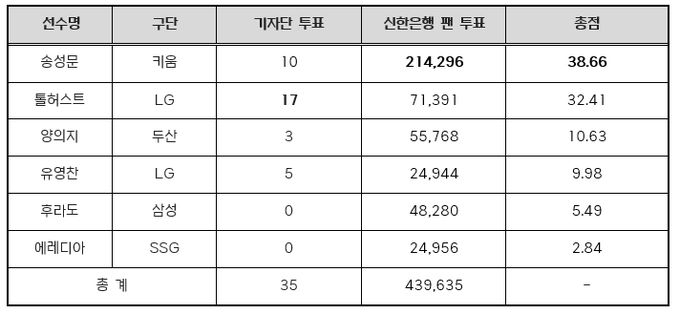 송성문은 기자단 투표 총 35표 중 10표(28.6%), 팬 투표 43만 9,635표 중 21만 4,296 표(48.7%)로 총점 38.66점을 받아, 기자단 투표 17표, 팬 투표 7만 1,391표로 총점 32.41점을 기록한 LG 톨허스트를 제쳤다.