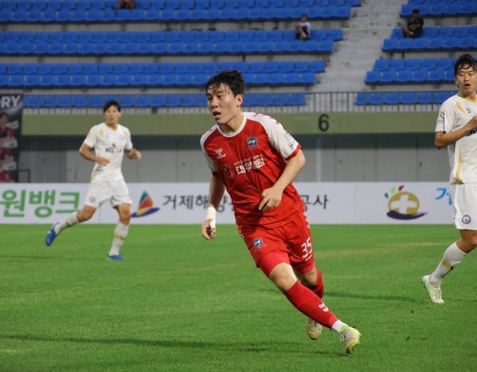 경기 전반 26분, 팀의 주장인 13번 두현석 선수가 상대 파울로 얻은 결정적인 기회를 살려 선제골을 터뜨리며 팀에 리드를 안겼다. 이후 거제시민축구단은 안정적인 경기 운영으로 전반을 1대 0으로 마쳤다.