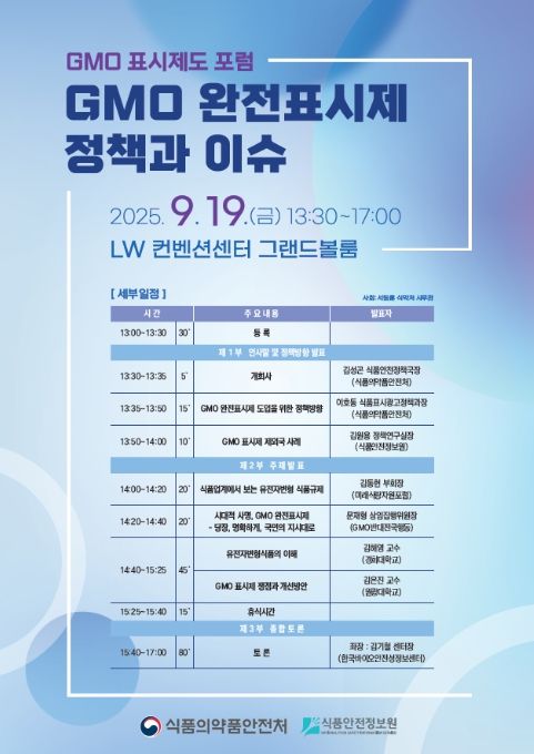 포럼에는 학계, 업계, 소비자단체 등이 참석하여 GMO 정책방향과 국제동향, GMO 완전표시제에 대한 산업계의 대응 전략 등에 대한 발표와 GMO에 대한 올바른 인식을 위한 홍보 방안 등에 대한 패널토론을 진행한다.