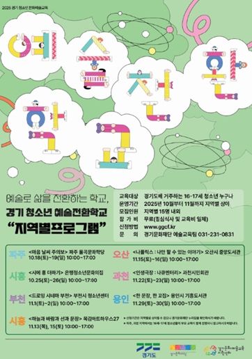 경기도와 경기문화재단은 16~17세 청소년들이 예술을 통해 자신을 돌아보고 미래를 설계할 수 있도록 돕는 ‘예술전환학교’를 10월부터 11월까지 도내 6개 지역에서 7개 프로그램을 운영한다. 지역별로 파주문화재단, 과천문화재단, 시흥시청소년재단, 부천시청소년센터, 시흥시 문화예술과, 오산시 중앙도서관, 용인시 기흥도서관이 청소년 문화예술교육 프로그램 운영을 위해 함께 협력하여 진행한다.