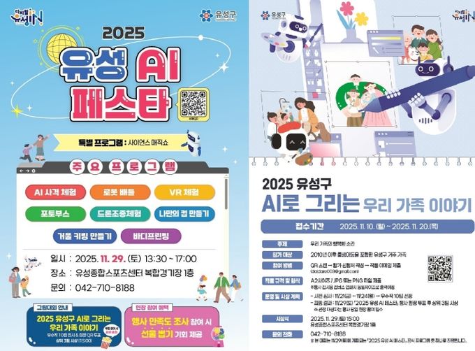 유성구는 오는 29일 유성종합스포츠센터에서 가족이 함께 즐길 수 있는 디지털 체험 축제 ‘유성 AI 페스타’를 개최한다. 참여 신청은 10일부터 유성다과상 홈페이지에서 선착순으로 가능하다.