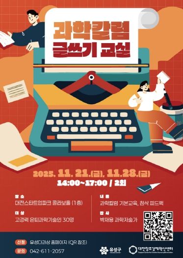 [와이뉴스] 대전 유성구는 오는 21일과 28일 대전스타트업파크센터에서 고경력 은퇴 과학기술인 대상 ‘과학 칼럼 글쓰기 교실’을 운영한다.