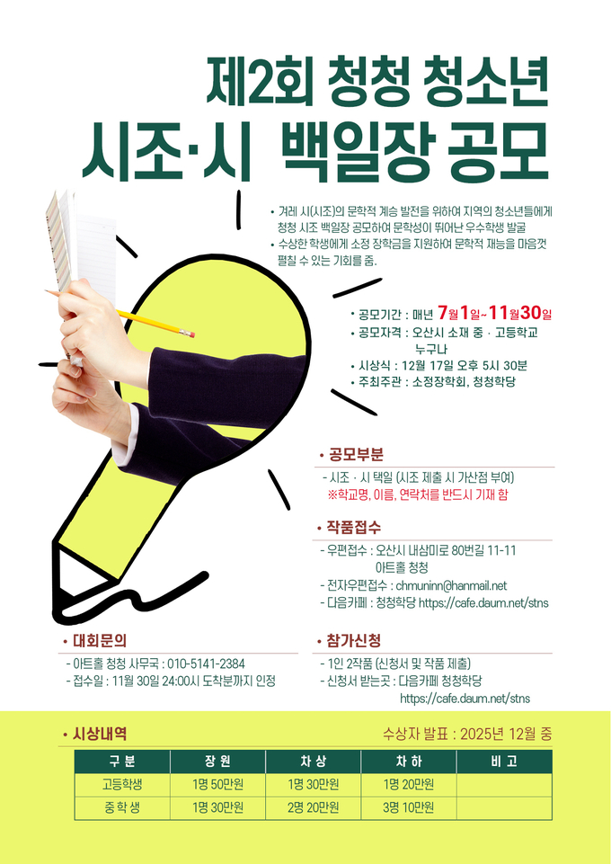 이번 백일장에서는 총 200만 원 규모의 장학금이 수여되며, 전문 작가의 심사를 거쳐 장원·차상·차하 수상자를 선정한다. 시상식은 오는 12월 17일 아트홀 청청에서 진행될 예정이다.