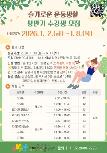 [와이뉴스] 광명시 광명건강생활지원센터는 새해를 맞아 시민들의 건강한 생활습관 형성과 만성질환 예방을 위해 2026년 상반기 ‘슬기로운 운동생활’ 운동 프로그램 참여자를 모집한다.