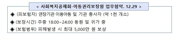 이번 야간 연장돌봄 사업에는 KB금융도 함께 참여한다. 복지부-KB금융 업무협약(’25.10.2.)을 통해 이번 사업 참여기관인 360개소를 포함한 전국 1천여 개 마을돌봄시설의 야간 시간대 이용아동과 종사자들의 안전을 함께 책임진다. 29일에는 사회복지공제회와 아동권리보장원이 업무협약을 맺어 연장기관 이용아동 및 기관 종사자를 대상으로 보험 가입 등을 지원할 예정이다.