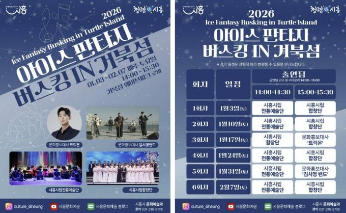 [와이뉴스] 시흥시는 지난 연말에 진행된 ‘2025 시흥 사운드 오브 윈터’의 열기를 잇는 후속 문화예술 프로그램으로, 겨울철 거북섬을 찾는 시민과 관광객에게 풍성한 즐길 거리를 제공하고자 ‘2026 아이스 판타지 버스킹 인 거북섬’을 운영한다.
