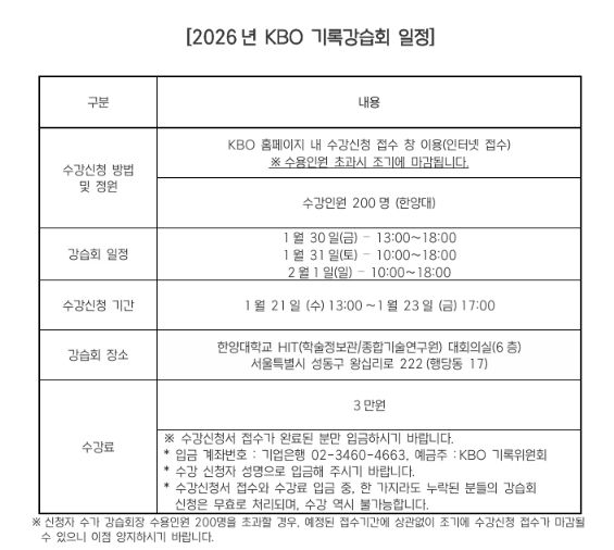 [와이뉴스] 2026년 KBO 기록강습회가 1월 30일(금)부터 2월 1일(일)까지 서울 한양대학교에서 개최된다. 기록강습회는 야구 공식기록법의 보급과 이해를 통한 저변 확대를 목적으로 프로야구 원년인 1982년부터 개최됐다.