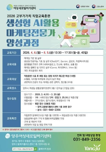 [와이뉴스] 양주여성새로일하기센터에서는 오는 3월 4일부터 20일까지 직업교육훈련 과정인 ‘생성형 인공지능(AI)활용 마케팅전문가 양성과정' 교육생을 모집한다.