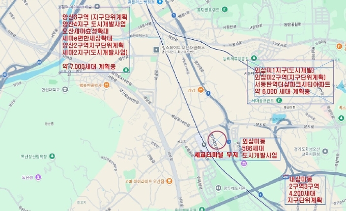 현재, 오산 세교터미널 부지와 그 주변 일대의 개발은 이미 확정됐거나 개발에 대한 지구단위 계획이 진행 중이다. 오산 세교터미널부지 일대에 들어서는 주택 계획을 들여다보면 내·외삼미동에 약 4,200(지구단위계획)세대, 양산 지역 일대 2,000세대, 세마2지구 1,659세대(도시개발사업) 등, 약 1만 6,000세대 상당의 아파트가 들어설 것으로 보고 있다.