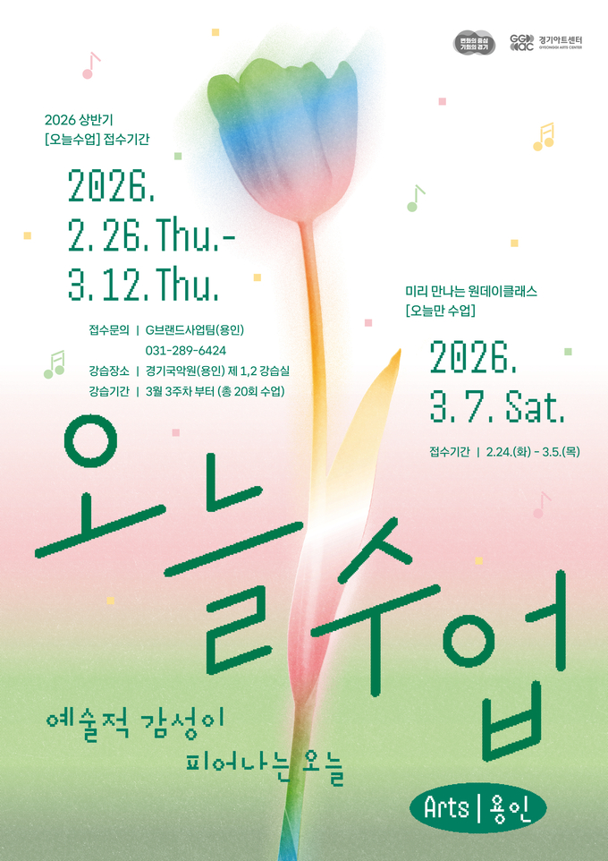 [와이뉴스] 경기아트센터(사장 김상회)는 도민의 예술 이해와 체험 기회를 넓히기 위해, 2026년 상반기 통합 예술교육 브랜드 ‘오늘수업 : ARTS’를 새롭게 선보이고 수강생 모집에 나선다. 모집 기간은 2월 26일(목) 오전 10시부터 3월 12일(목) 오후 5시까지이며, 정규 강좌는 3월 16일(월)부터 시작한다.