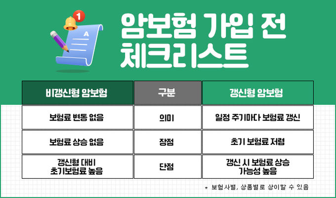 보험료 부담을 줄이려다 보면 저렴한 암보험을 찾게 마련인데 이때 암보험이 갱신형인지 비갱신형인지도 확인할 필요가 있다. 갱신형 암보험은 처음 납입하는 보험료가 저렴하게 느껴지지만 갱신을 할수록 보험료가 계속 높아질 수 있다. 반면 비갱신형은 초기 보험료는 갱신형보다 비싸게 느껴질 수 있지만 앞으로 오르지 않는다는 장점이 있으므로 갱신형 보험보다는 유지 면에서 유리하다. 개인의 소득과 생활패턴, 연령이 다르므로 암보험 갱신형과 비갱신형 중 선택을 하기 전 이러한 차이를 잘 알아두고 본인에게 가장 적합한 것을 고르는 것이 좋다.
