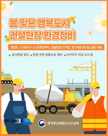 [와이뉴스] 행정중심복합도시건설청은 3월 18일부터 31일까지 행복청 발주·인허가 건설현장 21개소를 대상으로 봄맞이 환경정비를 실시한다.