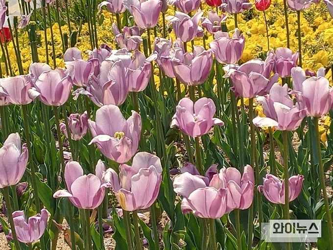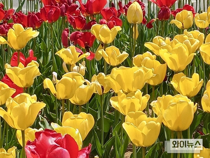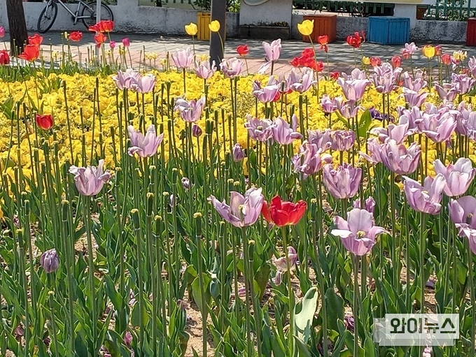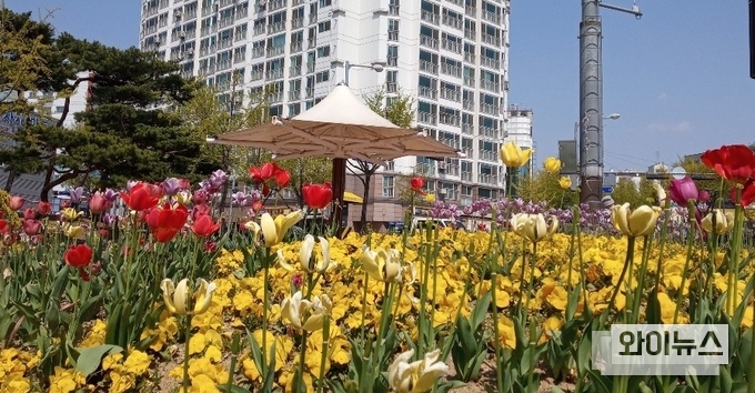최근 일본 도쿄 인근 지바현 사쿠라시의 면적 7천㎡에 이르는 우스이다 공원의 80만 송이 튤립이 몰려드는 관광객들로 모두 베어진 가운데, 24일 오후 경기도 수원시 도청 오거리 부근의 튤립이 화사하게 피어 있다. 한 시민은 "굳이 명승지를 가지 않더라도 출퇴근하며 보는 봄의 전령 튤립들이 보석같이 아름답다"고 했다.