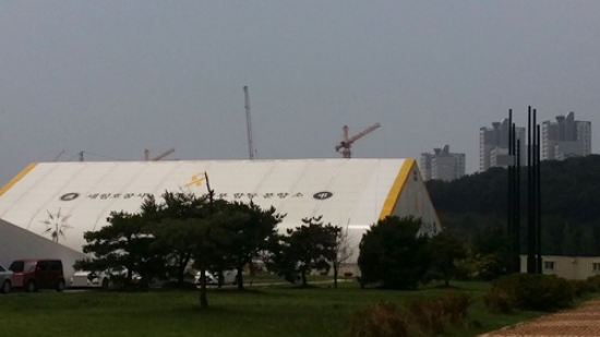 ▲ 안산시 세월호 참사 추모 기념관 건립 장소로 거론된 단원구 화랑유원지 내 임시합동분향소 전경이다. 뒤편으로 아파트 모습이 보인다.