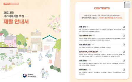 본 안내서는 재활의학의 관점에서 호흡 관리, 일상생활을 위한 피로 관리, 신체 활동과 운동, 인지 관리, 삼키기 관리, 목소리 관리 등 코로나19 감염 후 나타날 수 있는 증상을 관리하는 방법을 영역별로 담고 있다.