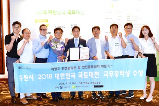 수원시 ‘파장초등학교 안전통학로 및 안전골목길쉼터 조성사업’이 ‘2018 대한민국 국토대전’에서 국무총리상을 받았다. 시상식은 18일 서울 콘래드호텔에서 열렸다.