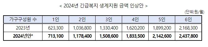 긴급복지 생계지원 금액은 2024년 국민기초생활보장 생계급여 인상에 따라 4인가구 기준 13.16% 인상되어 월 1,833,500원을 지원한다.