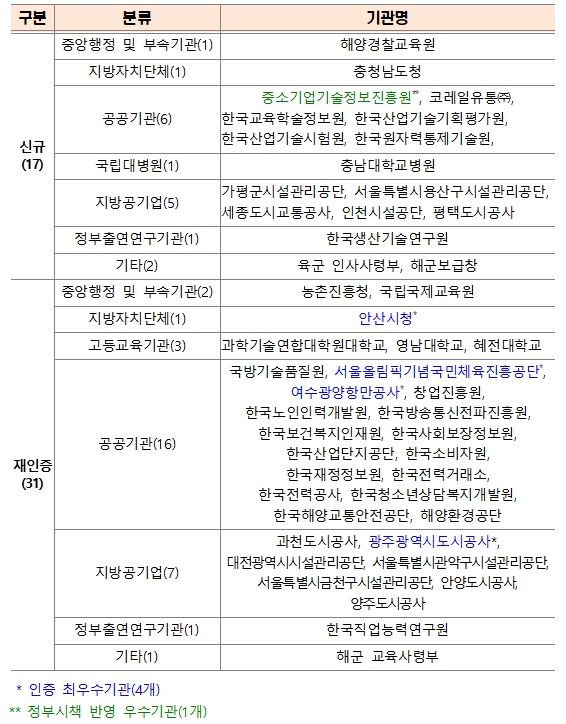 한편, ‘인사의 다양성’이라는 공공기관의 사회적 책무성을 제고하기 위해, 인증기관 중 균형 인사, 일·가정 양립 등에 노력한 1개 기관을 ‘정부시책 반영 우수기관’으로 선정하여 표창하며, 올해는 이 분야에서 ‘중소기업기술정보진흥원’이 우수기관으로 선정됐다.