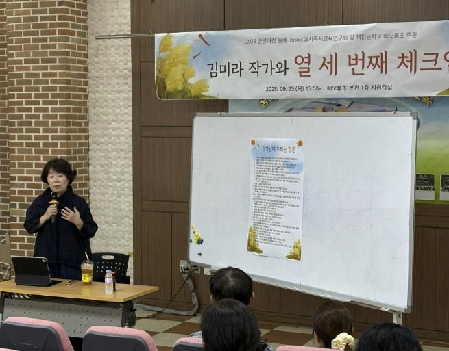 [와이뉴스] 안양과천 동네-book 교사 독서 교육연구회는 9월 25일 안양 해오름초등학교 1층 시청각실에서 독서 교육연구회 회원 및 안양, 군포 관내 희망 교직원들을 대상으로 ‘열두 번째 체크인’으로 알려진 김미라 작가와의 만남을 가졌다.
