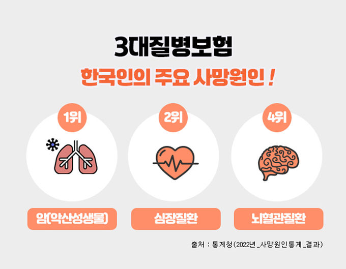 [와이뉴스] 3대질병으로 일컬어지는 암, 뇌혈관질환, 심혈관질환은 한국인의 주요 사망원인에서 상위를 차지하고 있으며, 이에 대한 진단비를 집중적으로 보장해 주는 보험상품을 3대질병진단비 보험이라 할 수 있다.