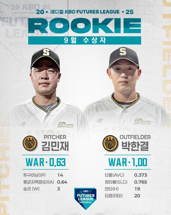 [와이뉴스] 2025 메디힐 KBO 퓨처스리그의 9월 퓨처스 루키상 수상자로 투수 부문에는 상무 김민재가 WAR 0.63, 타자 부문에는 상무 박한결이 WAR 1.00을 기록하며 각각 선정됐다.