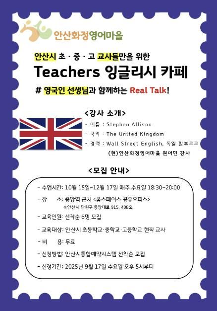 티처스(Teachers) 잉글리시 카페는 영어 회화에 관심이 있는 관내 초·중·고 교사를 대상으로 영어 말하기, 수업 영어, 영어 학습 네트워크 형성 등을 제공하는 프로그램이다. 안산화정영어마을의 원어민 교사가 직접 진행한다.