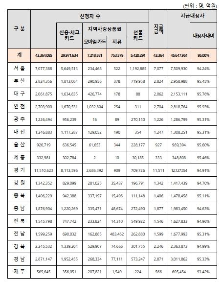 [와이뉴스] 2차 민생회복 소비쿠폰 신청·지급 개시 이후 4주간(9.22(월)~10.19(일)) 지급대상자의 95.0%인 4천336만 명이 신청하고 4조 3천364억 원이 지급되어, 추석 연휴 간 오프라인 신청이 불가능했음에도 불구하고, 대다수 국민들이 소비쿠폰을 신청·지급받은 것으로 나타났다.(10.19. 24시 기준)