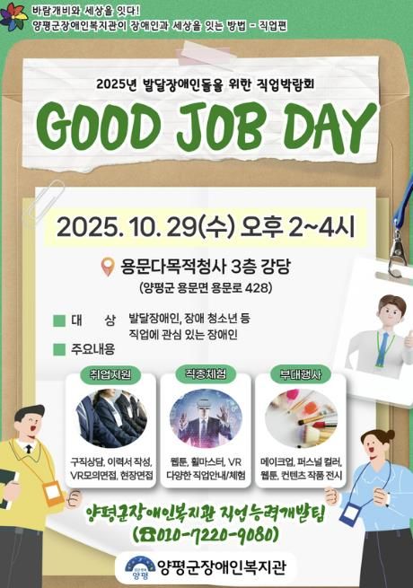 [와이뉴스] 대한불교조계종사회복지재단이 운영하는 양평군장애인복지관은 오는 29일 오후 2시부터 4시까지 용문다목적청사 3층 강당에서 발달장애인의 직업 탐색 기회를 지원하기 위한 직업박람회 ‘GOOD JOB DAY’를 개최한다.