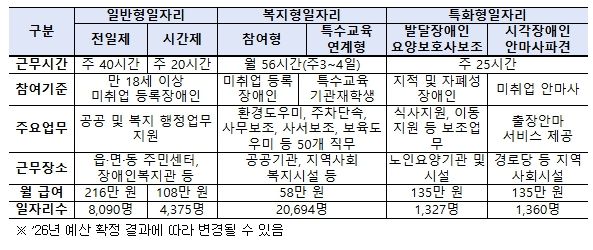 2026년 장애인일자리 지원사업(정부예산안 기준)은 2025년 3만 3,546명 대비 2,300명 확대된 3만 5,846명이며, 일반형일자리(전일제, 시간제), 복지형일자리, 특화형일자리(시각장애인안마사 파견, 발달장애인요양보호사 보조) 3개 유형으로 구분하여 시행하고 있다.