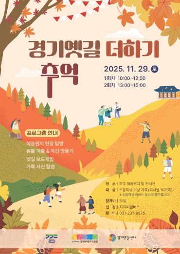 [와이뉴스] 경기문화재단 경기역사문화유산원는 오는 11월 29일 토요일, 의주길에 위치한 파주 혜음원지 일대에서 초등학생 이상 자녀를 둔 가족을 대상으로 하는 역사 체험 프로그램 ‘경기옛길 더하기 추억’을 개최한다고 밝혔다.