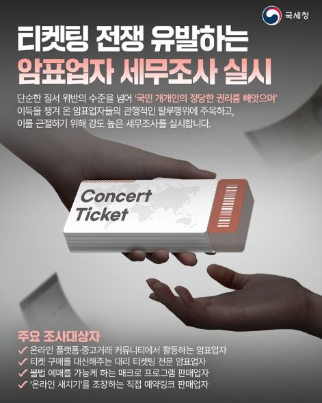 [와이뉴스] 단순한 질서 위반의 수준을 넘어 '국민 개개인의 정당한 권리를 빼앗으며' 이득을 챙겨 온 암표업자들의 관행적인 탈루행위에 주목하고, 이를 근절하기 위해 강도 높은 세무조사를 실시합니다.