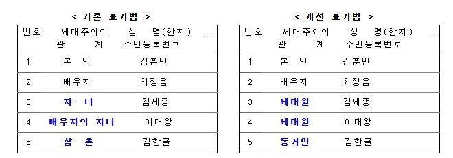 앞으로 등·초본에는 세대주의 배우자 외 가족(부모, 조부모, 형제자매 등)은 ‘세대원’, 그 외에는 ‘동거인’으로 표기된다. 다만, 민원인이 희망하는 경우 기존 표기법대로 등·초본에 상세한 가족 관계를 표기할 수 있다.