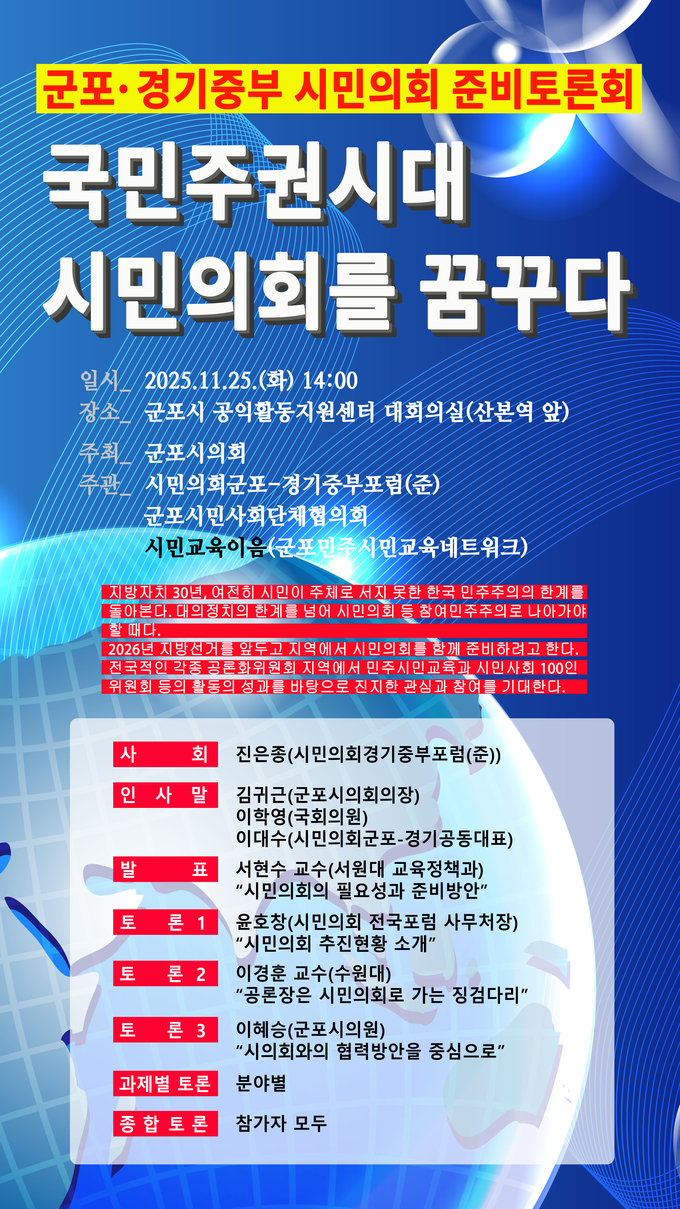 이를 위해 시의회가 앞선 11월 25일 군포시공익활동지원센터에서 ‘국민주권시대 시민의회 준비토론회’를 개최했다고 밝혔다.