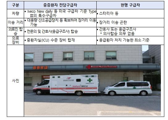 중증외상, 심·뇌혈관 질환과 같은 중증응급질환은 시간이 지남에 따라 생존율이 급격히 낮아지므로 치료가 가능한 병원으로 환자를 신속히 이송해야 한다. 이송 과정에서 환자 상태에 맞는 적절한 치료 또한 중요하다. 이에 따라 보건복지부는 닥터헬기와 중증환자 전담구급차와 같은 중증응급환자 이송체계를 운영하고 있다.