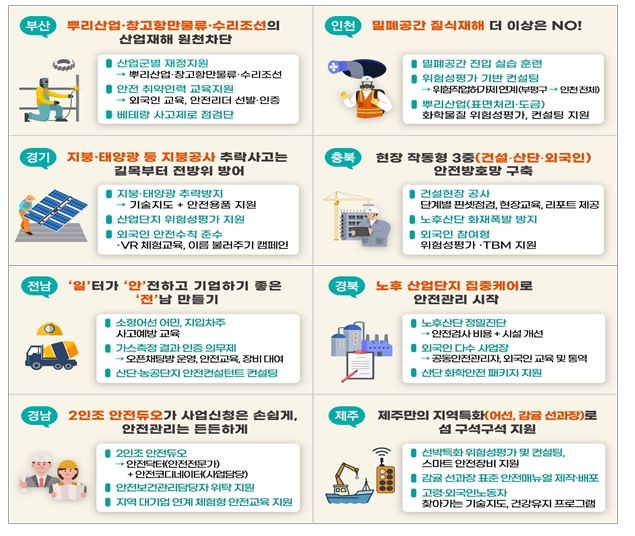 지방정부들은 안전관리자 선임이 어려운 작은 사업장들을 위한 공동안전관리자 지원, 어선작업현장‧농축산업 등 기존 지원사업들이 닿기 어려웠던 일터 지원, 뿌리산업‧조선업 등 지역의 사고다발 업종 집중지원, 외국인노동자 등 안전 취약계층에 대한 지원을 중심으로 특화사업을 기획했다.