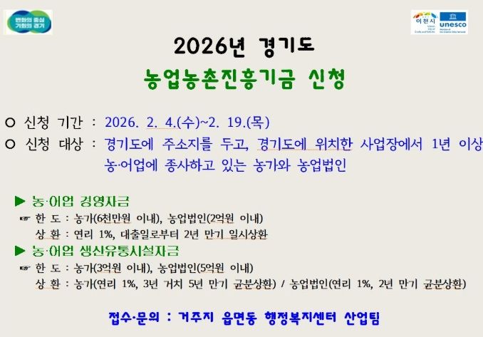 [와이뉴스] 이천시는 농업인에게 장기·저리 융자 지원을 실시하고 경영안정을 돕기 위해 2026년 경기도 농업농촌진흥기금 농어업 경영자금, 농어업 생산유통시설자금 사업에 대한 신청을 2월 3일부터 접수한다.