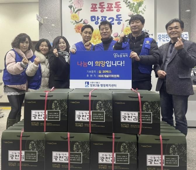 [와이뉴스] 영통구 망포2동 행정복지센터는 지난 6일 망포2동 바르게살기위원회가 관내 저소득 가정을 지원하기 위해 김 20박스를 기탁했다고 밝혔다.