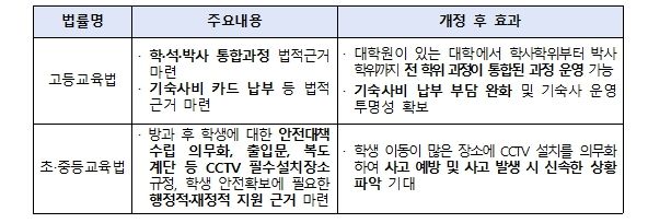 교육부는 향후 시행령 개정을 통해 학·석·박사 통합 과정의 수업연한 단축을 규정할 예정(최대 2년 6개월 단축 검토)이다. 이를 통해 통상 8년(학사4년, 석사2년, 박사2년)이 소요되는 대학 입학부터 박사학위 취득까지의 기간을 단축하여, 인공지능(AI) 등 첨단분야 박사급 고급인재의 조기 양성이 가능해진다.