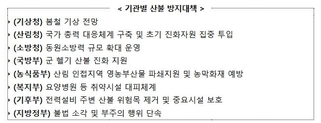 김광용 재난안전관리본부장은 “정부는 산불 위험이 본격 증가하는 봄철을 앞두고, 국가 총력 대응체계를 철저히 유지하면서 산불 예방과 초기 대응에 만전을 기하겠다”라며, “국민 여러분께서도 산림 인접 지역에서 영농부산물이나 쓰레기 등을 소각하지 말고, 연기나 불씨를 발견하면 즉시 산림당국 또는 119, 112에 신고해 주시기 바란다”라고 당부했다.