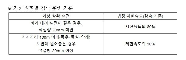 이러한 사전 예고를 바탕으로 악천후 시, 암행순찰차의 단속 기준은 일괄적으로 ‘고속도로 제한속도의 80%(20% 감속)’를 적용할 예정이다. 이는 운전자가 기상・노면 상태에 맞춰 속도를 줄이는 안전운전 문화를 조기에 정착시키고 고속도로 위 대형 사고를 선제적으로 예방하는 조치다.