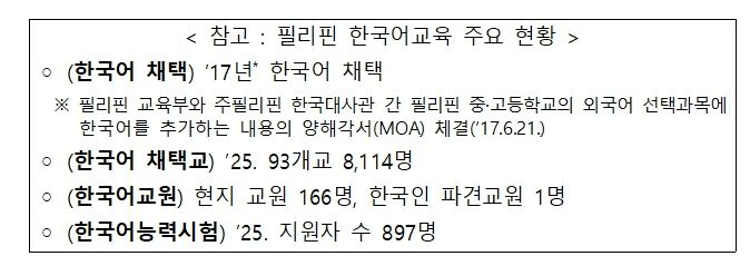 필리핀은 2017년에 현지 정규 교육과정의 외국어 과목으로 한국어를 정식 채택하는 것으로 결정하고, 2018년부터 한국어반을 운영해 왔다. 현재는 90여 개 학교에서 8,000여 명의 학생들이 한국어를 배우고 있다. 이번 양해각서는 한국 교육부가 필리핀 내 한국어 교사들을 위한 집중 연수 과정을 지원하여, 한국어교육 전문성을 높이도록 하는 내용이 핵심이다.