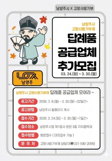 [와이뉴스] 남양주시는 오는 3월 24일부터 고향사랑기부제 참여자들에게 제공할 ‘2026년 고향사랑기부제 답례품 공급업체’ 추가 모집 접수를 시작한다고 6일 밝혔다.