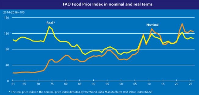 [와이뉴스] 유엔 식량농업기구(FAO)에 따르면, 2026년 2월 세계식량가격지수는 전월(124.2포인트) 대비 0.9% 상승한 125.3포인트를 기록했다. 품목군별로 유제품, 설탕 가격은 하락하고 곡물, 유지류, 육류 가격은 상승했다.