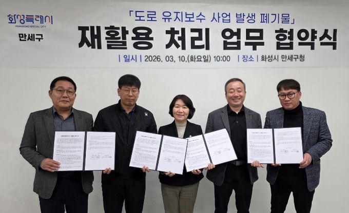 [와이뉴스] 화성특례시 만세구가 도로 유지보수 과정에서 발생하는 폐기물을 효율적으로 처리하고 자원 재활용을 확대하기 위해 관내 아스콘 생산 업체와 ‘폐아스콘 재활용 처리 협약’을 체결했다.