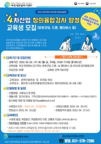 [와이뉴스] (재)화성시여성가족청소년재단(대표이사 김경륜) 화성여성새로일하기센터는 여성가족부가 지원하는 직업훈련교육의 일환인 '4차산업 창의융합강사 양성과정' 교육생을 2022년 4월 15일까지 모집한다.